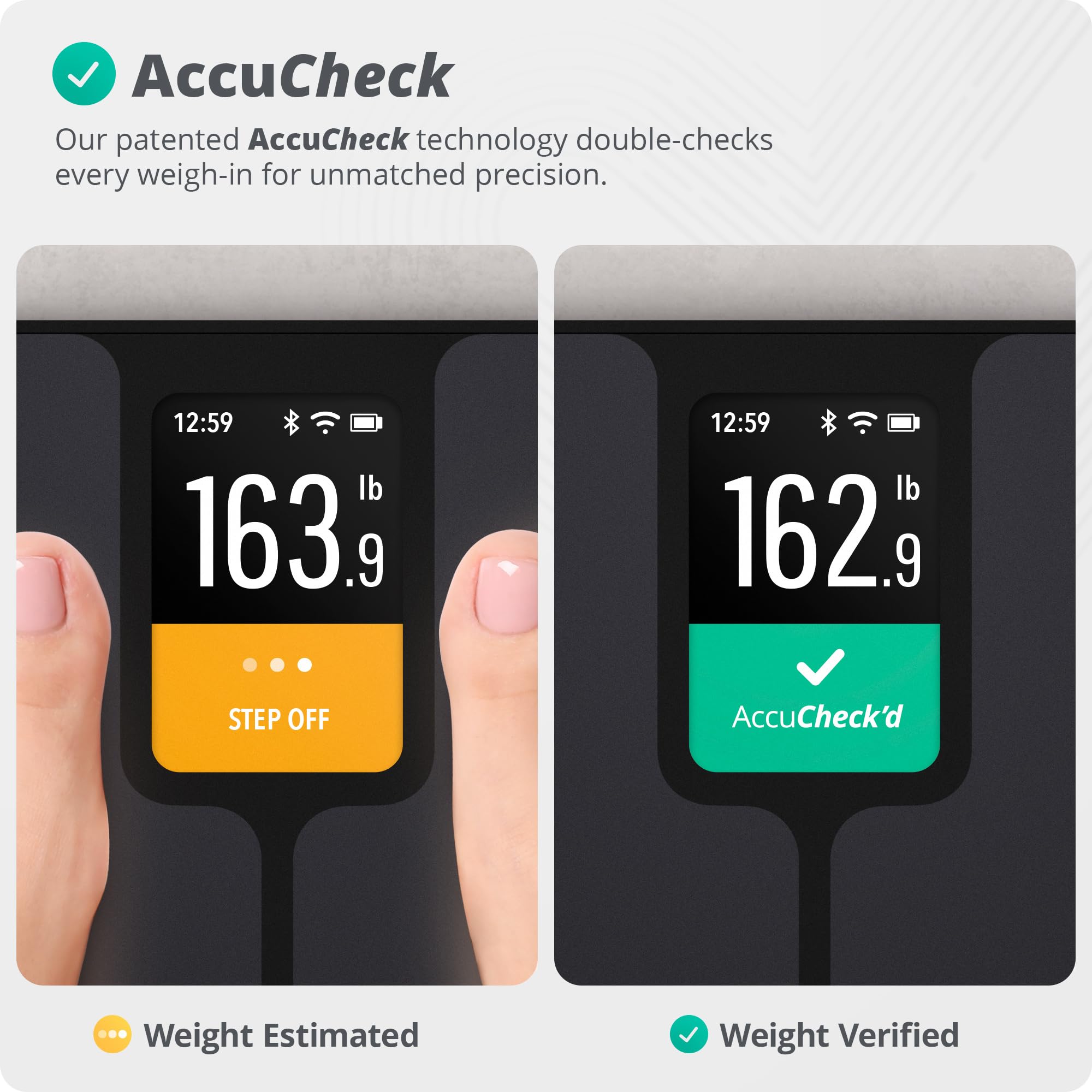 - AccuCheck Verified Accuracy: Our body weight scale uses dual-sensor technology to double-check results, so you can trust every number and see real progress.